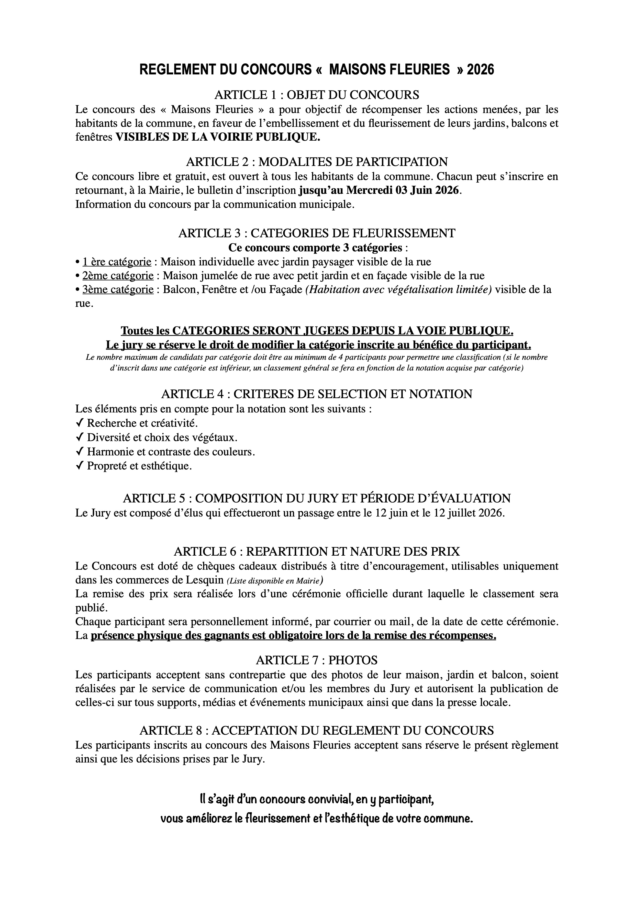 Le jury, composé d’élus municipaux, évaluera les réalisations entre le 12 juin et le 12 juillet 2026 en se basant sur plusieurs critères : créativité, diversité des végétaux, harmonie des couleurs et soin apporté à l’ensemble.